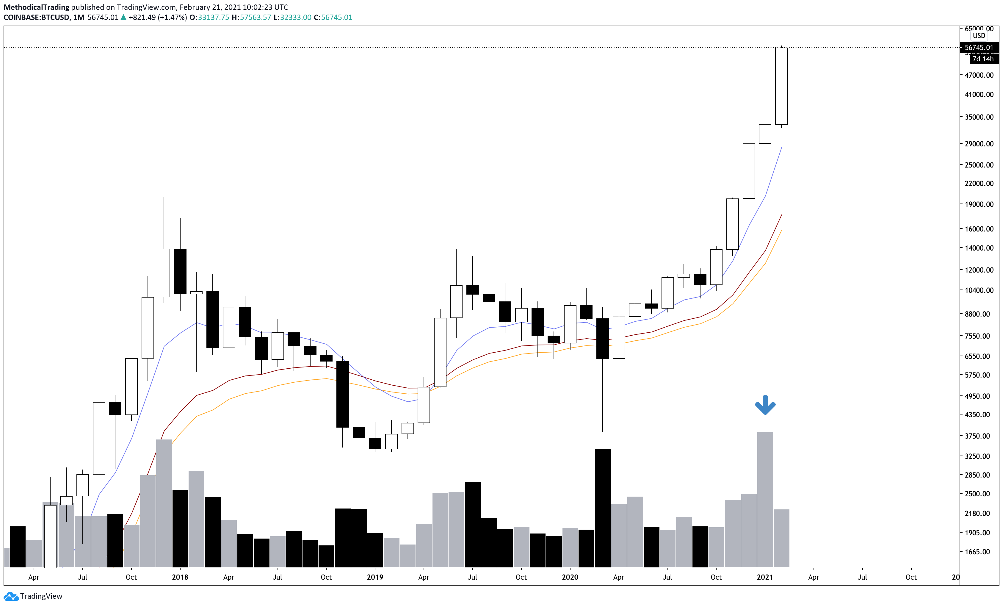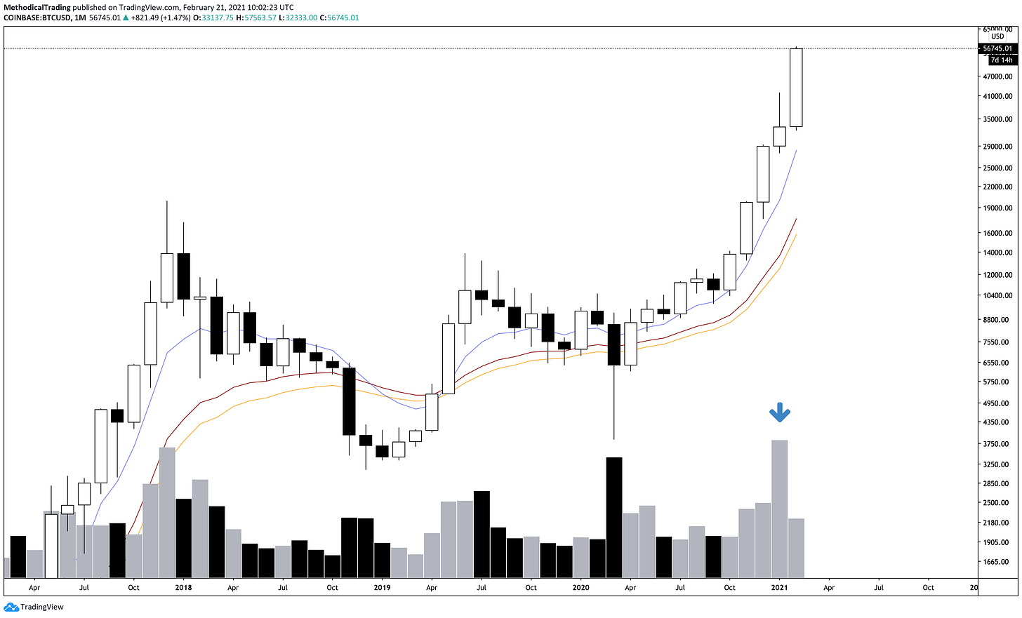 A quick glance at the Monthly chart shows that institutions are indeed coming in droves. The Bitcoin volume on Coinbase broke the previous Volume record that was set in December 2017 which was primarily fueled by Retail money. The current volume from the likes of MicroStrategy, Guggenheim, Tesla, etc. puts into perspective how important and large their buys are for Bitcoin. Generally speaking, Institutional money has a much longer term outlook in regards to their investments and/or assets they choose to help keep cash reserves afloat and beat inflation. Coinbase is the #1 exchange for OTC deals and is the primary exchange that Institutions in the U.S are going to flock to as time goes on.