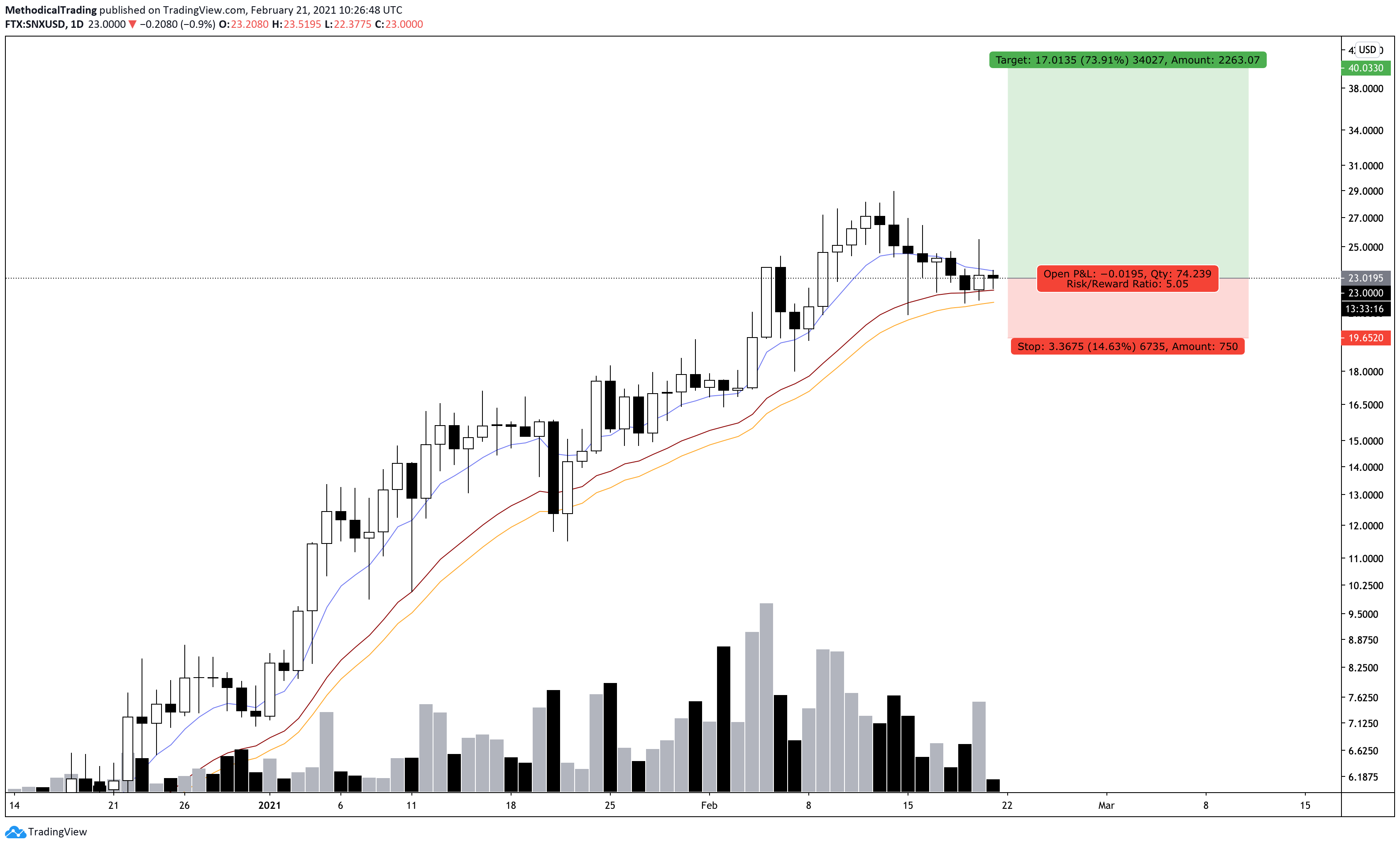 SNX is one of the few coins that have not popped yet. SUSHI, UNI, DOT, and a few other DeFi Alts have already broken out of consolidation to resume a strong uptrend. SNX appears to be primed here as well and is being compressed between the EMA 8 along with the EMA 21/26’s. A long opportunity here is to good to pass up on and targeting fresh All Time Highs makes sense as well. $40 SNX does not seem too far away if the uptrend continues to hold up.