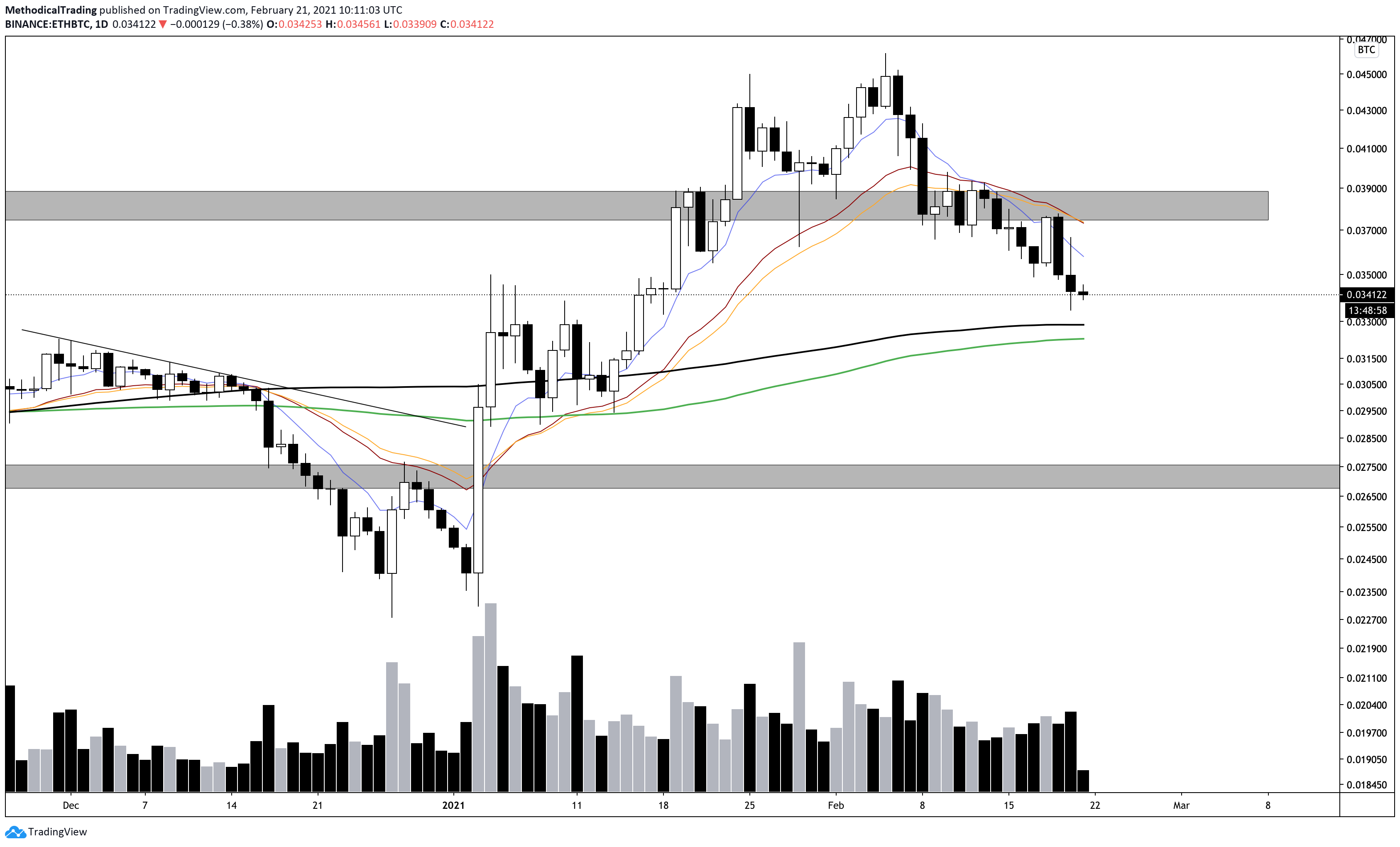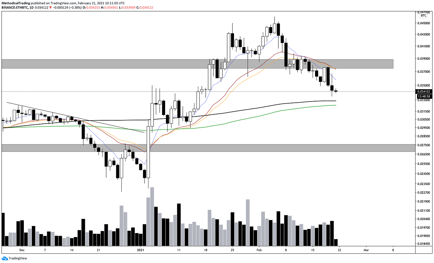 Taking a look at the Daily here, price actually retested the previous Support as Resistance before getting shot back down. ETH/BTC is now moving towards the 200 MA/EMA’s (Black/Green) that must be held in order for any sort of bullishness to remain in this pair. Make no mistake, the USD price of Ethereum CAN STILL GO UP while the BTC pair is going down. However, if ETH/BTC continues to fall while Bitcoin moves upwards, then it just means that you would have made more money staying in Bitcoin rather than Ethereum. Price absolutely must hold the 200 MA/EMA’s in order to justify diversification from BTC into ETH.