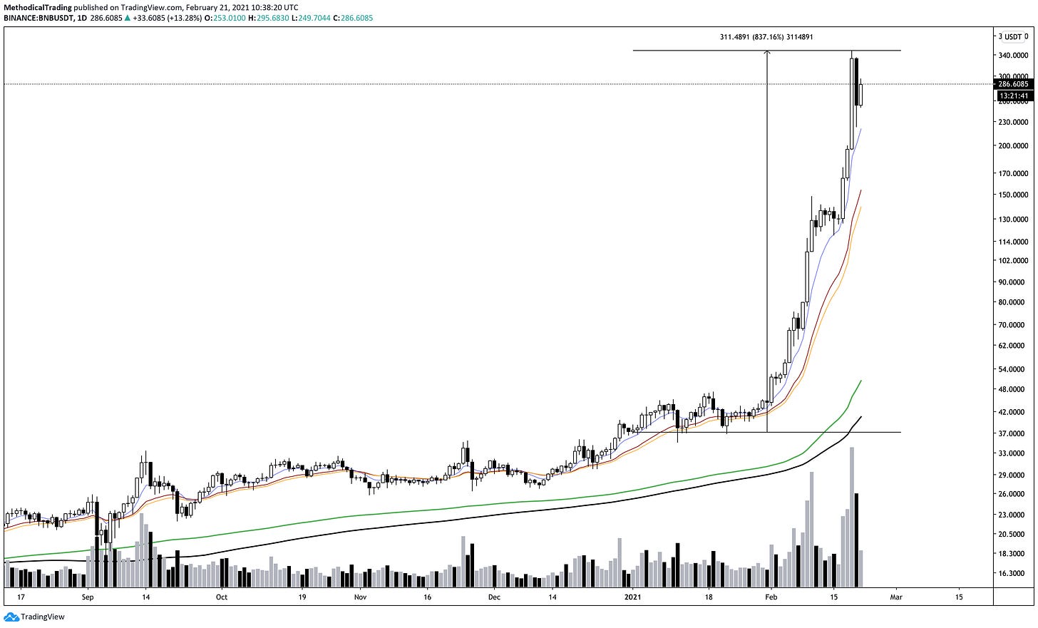 Not much can be said here for BNB other than wow! Price has pulled an over 800% move since the beginning of the year. One huge advantage that Binance has is the implementation of Binance Smart Chain. The cross-chain compatibility and low fees are what help contribute to the parabolic rise of BNB and the underlying tokens. If you don’t know what the Binance Smart Chain (BSC) is, then you can learn more by clicking on the link below. Fundamentally, exchange coins/tokens already have meaningful value all crypto currency investors alike. The rewards, staking, discount on fees, referrals, coin burns, etc. are all things that contribute to the rise of not just BNB, but all other exchange coins as well.