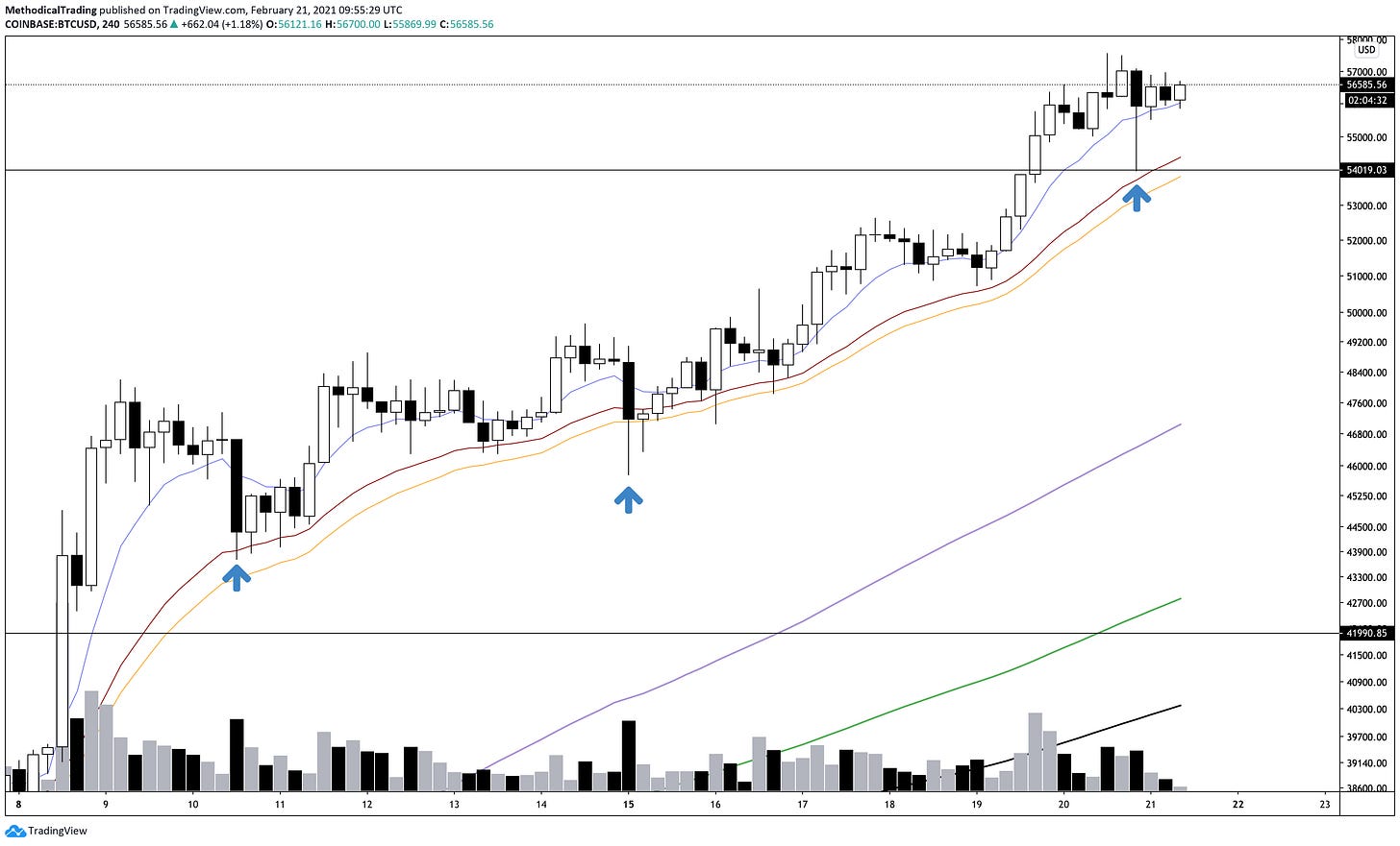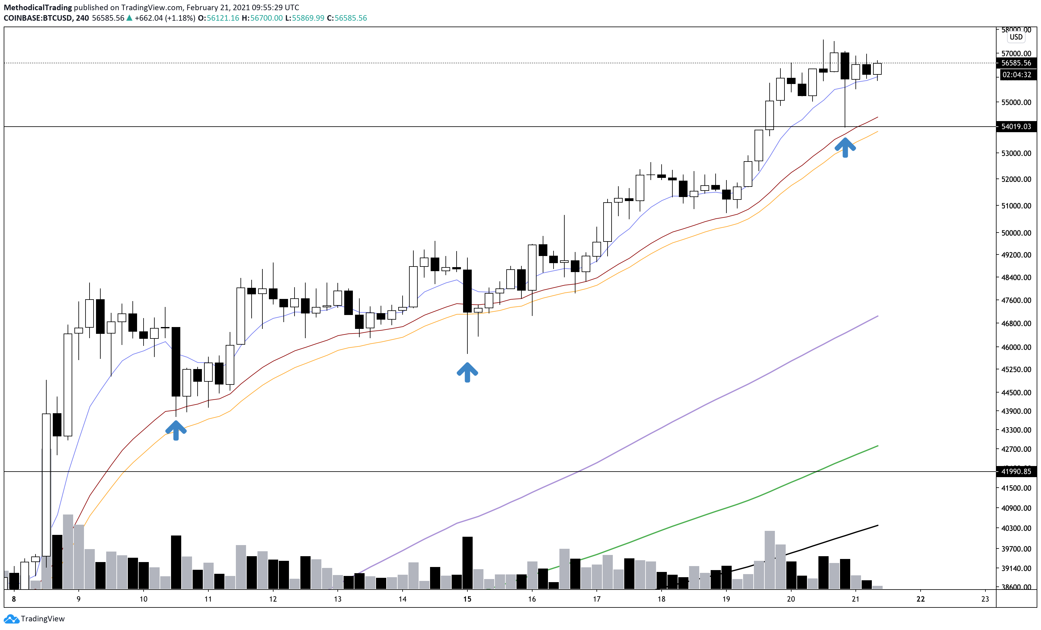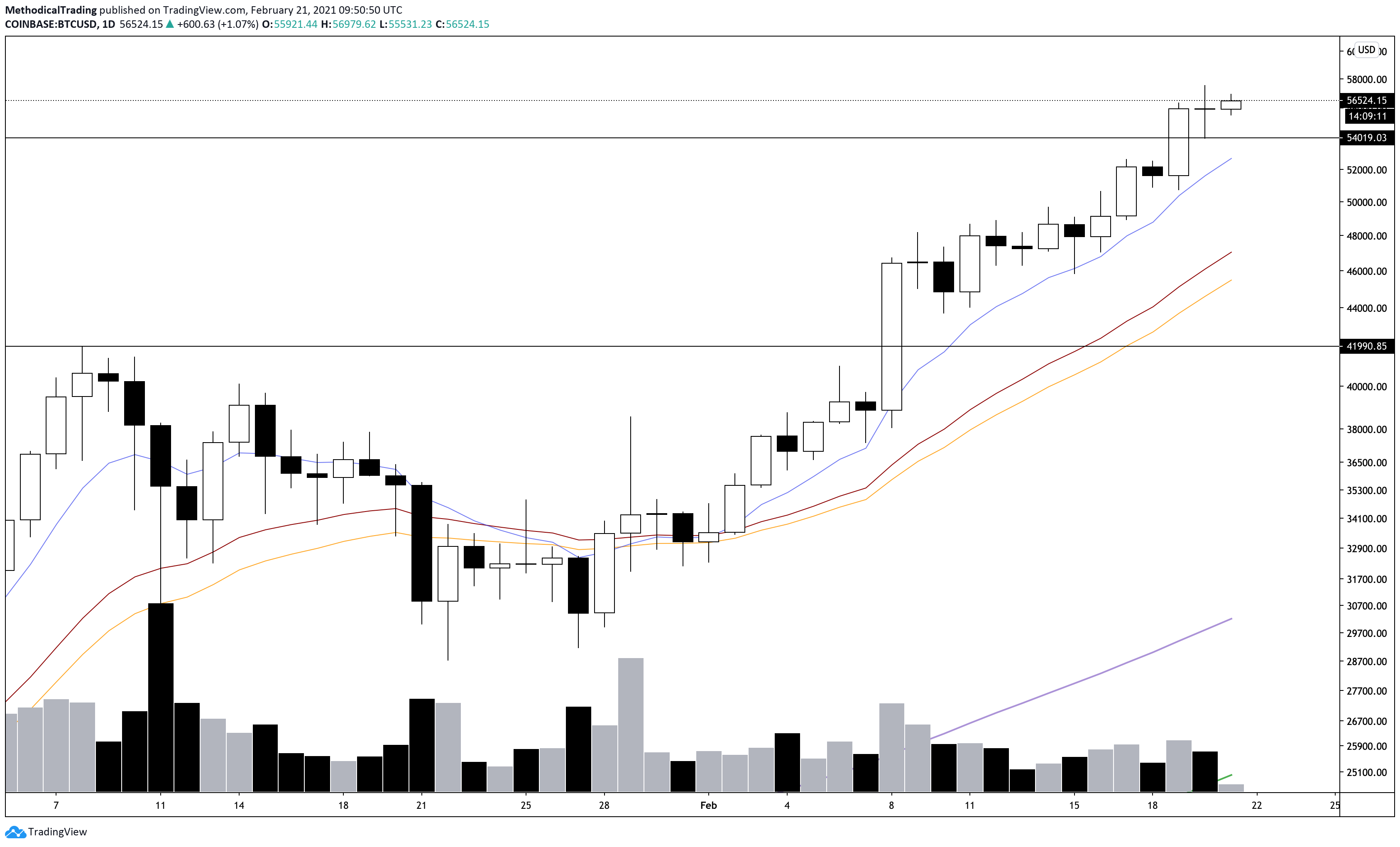 The Daily chart looks quite simple so far, price has continued to hold the EMA 8 (Blue) which is clear sign of a strong uptrend. As long as this EMA 8 is held, then Bitcoin should continue to move upwards in a bit of a parabolic movement. It is worth noting that the $54,000 level was the low from yesterday’s candle, which signifies that the 1 Trillion level is indeed a key region to pay attention to. If price were to break below the EMA 8, then the next EMA’s to look for would be the 21 & 26 (Brown/Orange) at roughly $47,500 and $45,000. These would be further EMA’s to pay attention to in order for Bitcoin to maintain a Short-Medium term uptrend.