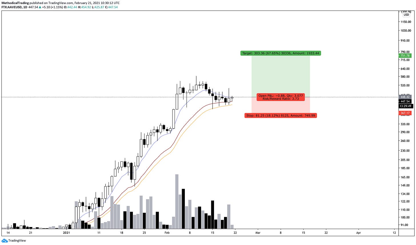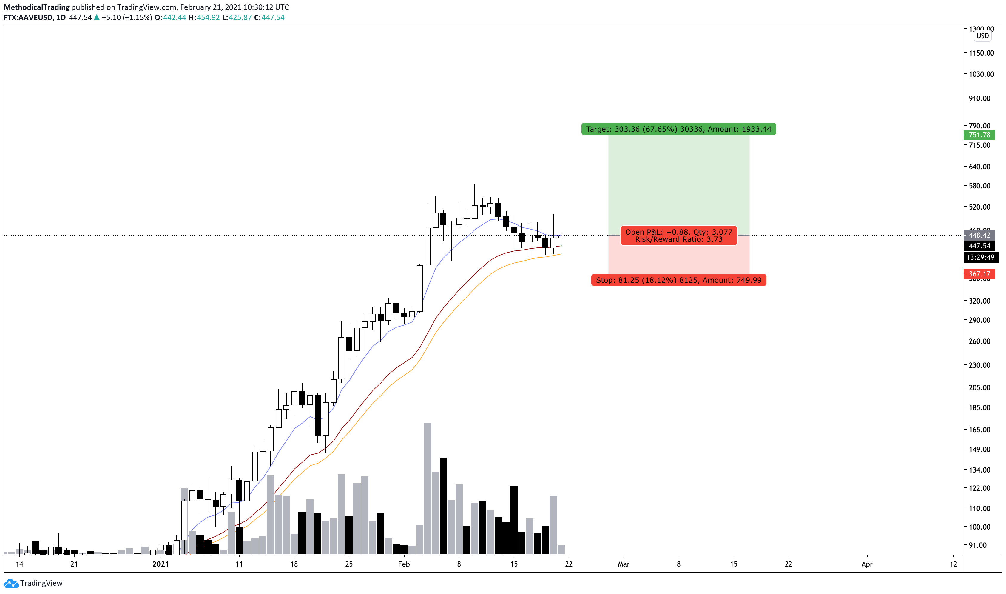 AAVE appears nearly identical to SNX as well. Price is consolidating and compressing between the EMA’s here and any break towards the upside should be met with fresh All Time Highs. A Stop Loss well below the 21/26 EMA’s would be a good way to avoid any sort of flash crashes and position size should be adjusted accordingly to accommodate for this. My risk is being managed here because the upside is already massive and could play out in a relatively short timeframe. Their is no need to get greedy when trading Alts that can explode upwards like this! Simply play it smart and position each trade accordingly.