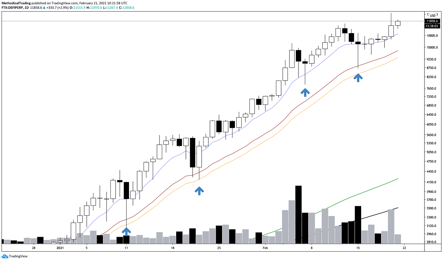 DeFi has continued to almost completely ignore and/or Bitcoin price movements so far for 2021. However, larger pullbacks still have an immediate effect on DeFi and every other Alt across the board. The difference here is that DeFi is being met with extremely strong buybacks that continue to propel the Index upwards. Take a look at the previous 4 hour wicks down in February. Each wick here on the Index has presented a strong buying opportunity and it is no secret that our team has been extremely bullish on DeFi over the past couple months. Coins such as UNI, SUSHI, SNX, YFI, etc. are all examples of strong uptrends that continue to hold up.